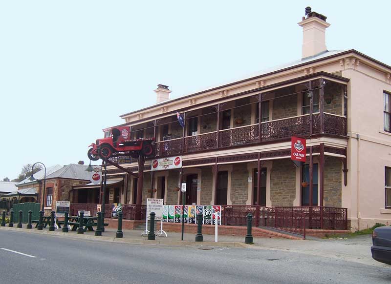 Blumberg Inn was built as a single storey hotel and was first named, amusingly, the Napoleon Bonaparte reputedly because some of the local citizens had fought with Bonaparte. It has changed many times (note the car in the front) but by the 1880s it had been turned into the two storey bluestone building with impressive ironwork and a charming upstairs balcony which can be seen today. It is now a central part of the town's main street.