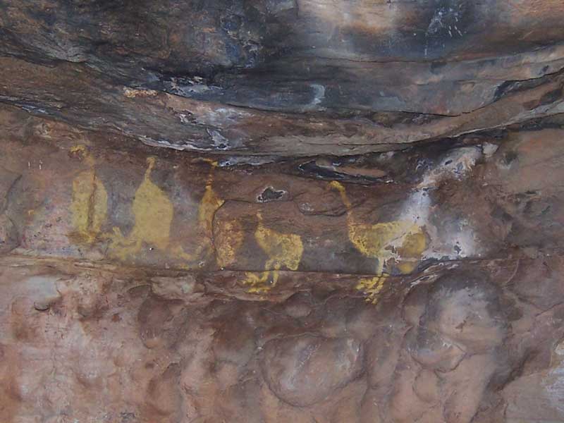 A group would use this method if camping in an area for a lengthy period, so that fresh meat was readily available without having to hunt every day. Bird tracks, hand stencils, other animals, grids and lattices are also depicted. Some of the more notable motifs include a woman with very long fingers and toes, a painted human hand with solid discs, and a man in a tree watching a line of six emus.