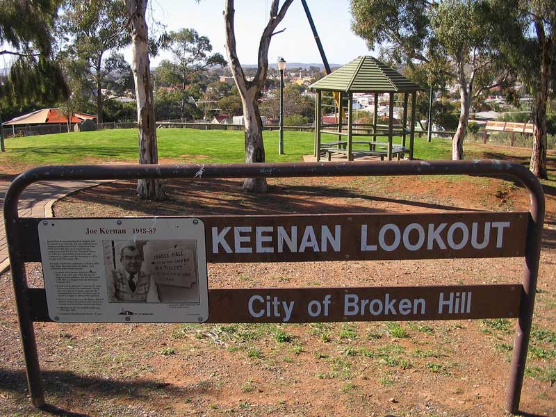 This lookout provides an excellent panoramic view of Broken Hill and the line of lode. It was named in honour of Peter Joseph Keenan, President of the Barrier Industrial Council from 1969 to 1985, and city Alderman from 1953 to 1962. Adjacent is the Mica Street filtration plant which still retains the original stone reservoir built in 1894 to take water pumped from the Stephens Creek Reservoir.