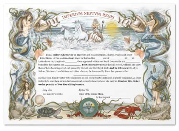 "Whereas by our Royal Consent,.................... has this day entered Our Domain. We do hereby declare to all whom it may concern that it is Our Royal Will and Pleasure to confer upon him/her the Freedom of the Seas without undue ceremony. Should he/she fall overboard, We do command that all Sharks, Dolphins, Whales, Mermaids and other dwellers in the Deep are to abstain from maltreating his/her person. And we further direct all persons who have not crossed Our Royal Domain, to treat him/her with the respect due to One of Us. Given under Our Hand at Our Court on board RMS Strathaird on the Equator in Longitude ..... on this ..... day of ..... in the year .....