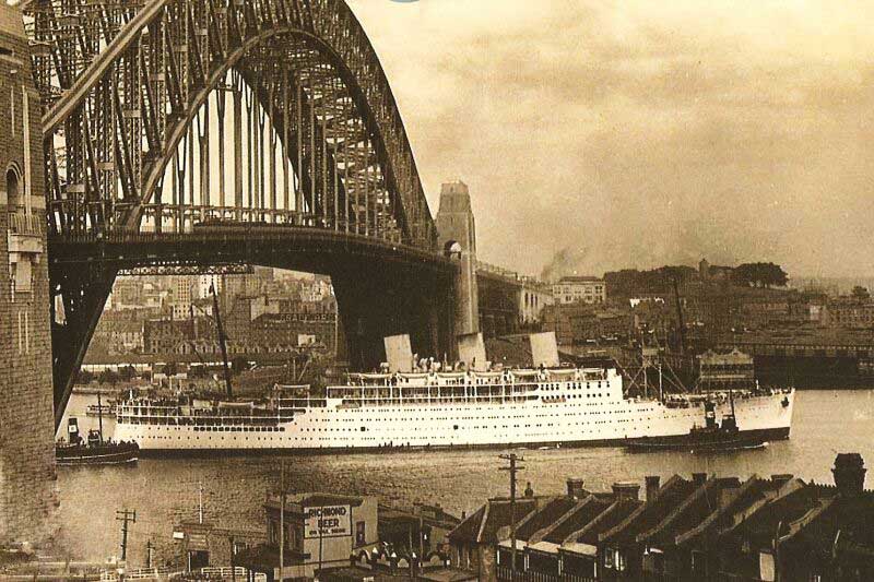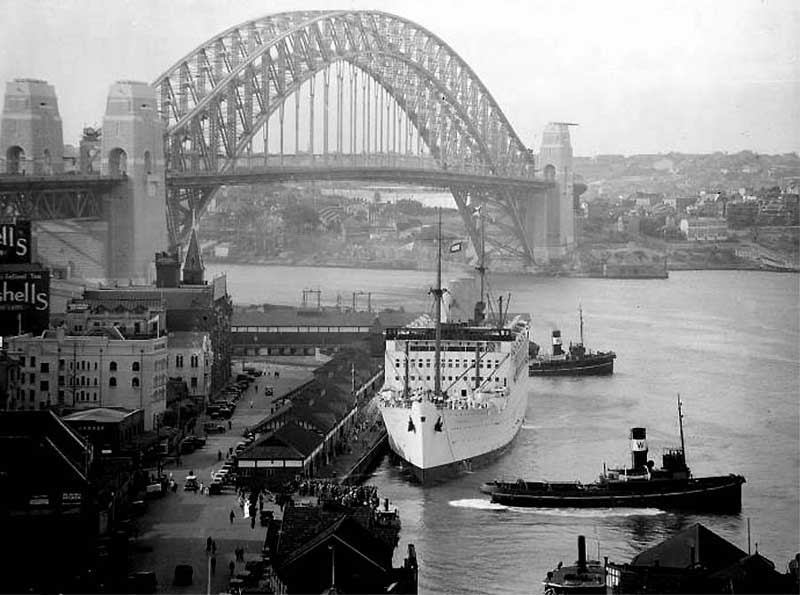 RMS Strathaird sails under the Sydney Harbour Bridge, 1954