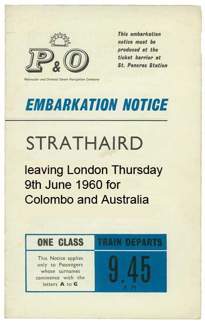 Once we received notification of our acceptance as migrants, we sold our house in Otley and moved into temporary rental accommodation during Mum's course of iron tablets. We had been advised to sell our furniture but keep our clothes and personal items, which we did. During the time of waiting for notification of our sailing date, I had my first taste of television. I remember going to a neighbour's house and seeing a children's programme on their new television. A few weeks later, I sat in awe and watched the wedding of Princess Anne to Lord Snowden, Anthony Armstrong Jones, the first live broadcast of its kind anywhere in the world. To our surprise, we received only a few weeks notice of our date and time of departure. We were required to board a train at St Pancras station in London at 9.45am on 9th June 1960. Our ship, RMS Strathaird, would sail for Australia via Piraeus, Port Said, Aden and Colombo that night.