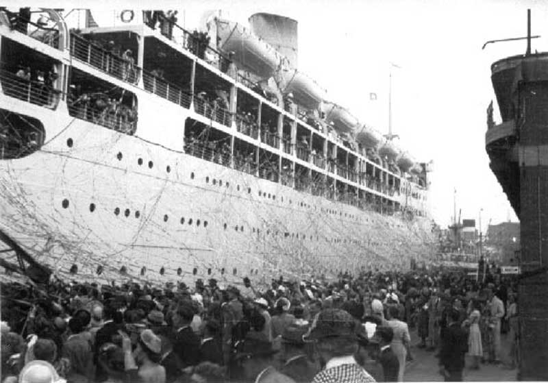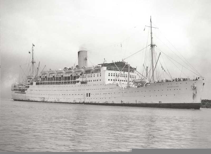 We apparently took on board a contingent of Greek migrants at Piraeus though I never saw any during the rest of the voyage. Other people told me about them, but I dismissed it as one of the many rumours that began circulating the ship after leaving Piraeus when the novelty of the voyage had worn off and people needed something to talk about. One of those rumours was that the Strathaird was so old, she had served in the two world wars and her hull had been patched in more places than it was possible to mention. Such was not the case though Strathaird, together with the other P&O passenger ships including all the 'Strath' sisters, had been requisitioned by the British Government during World War II. Her first mission was to be part of a convoy which left Sydney in January, 1940 carrying Australian and New Zealand troops to the Suez Canal to defend that important lifeline which was also one of the highlights of the voyages in more peaceful times. One of her wartime adventures was sailing from Brest for Plymouth at the time of the Dunkirk evacuation, with every inch of her cabin space and decks crammed with 6,000 troops and refugee men, women and children. In her strong room was gold rescued from British banks in Paris before the German occupation. Happily, Strathaird was one of the ships that survived the hazards and the bombings of wartime service. Her sister ship, Strathallan, was not so lucky. She was torpedoed and sunk by German U-Boat 562 in bright moonlight and fine weather shortly after passing through the Straits of Gibraltar about 75 kilometres (45 miles) off Bougie. She was hit in the engine room on the port side at 2.25 am on 21 December, 1942, two engineer officers and two Indian engine- room crew were killed in the explosion, but no other lives were lost. The destroyer HMS Verity picked up the nurses and 1,000 troops on board and another destroyer, HMS Laforey, took Strathallan in tow. With the help of the salvage tug Restive it was hoped that she might reach Oran, but her list increased and the remainder of the troops were taken off by escorting destroyers. At 1.15 pm she caught fire, and once it reached her cargo of rockets and ammunition, the rest of the crew were taken off by Restive. She sank 19 km off Oran at 4 am, 22 December 1942.