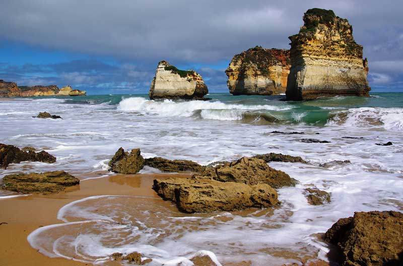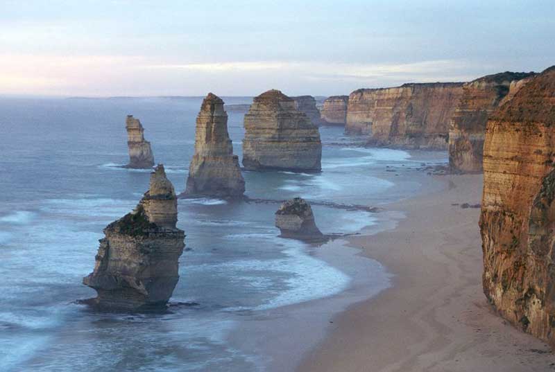 The south west coast of Victoria on the Great Ocean Road between Cape Otway and the town of Warrnambool is one of the most rugged and scenic stretches of coastline in Australia. Feared by sailors of old, many of whom lost their lives and their ships on its rocky shores, it is today a magnet for tourists and sightseers. The cliffs, bluffs, islands and beaches that we see today are the result of a retreating sandstone coastline under constant attack from the sea. Each year the cliff faces are being eroded at the rate of around two centimetres a year. Over the years, harder layers and columns of rock have resisted the erosion process, which have led to the stunning features found along this stretch of coastline.