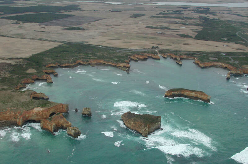The most photographed coastal feature in Australia, the Twelve Apostles is a string of sandstone stacks which have managed to survive the pounding of the Southern Ocean. The formation was originally known as The Sow and Pigs (or Piglets), Mutton Bird Island being the Sow, and shown thus on a map used by C.J. La Trobe during his March 1864 journey to Cape Otway. Many believe they were re-named in the 1950s (though in reality there are not twelve of them), however there are several "biblical" names hereabouts (Bay of Martyrs, Crown of Thorns Rock, The Grotto) shown on earlier maps so the name may well be much older.