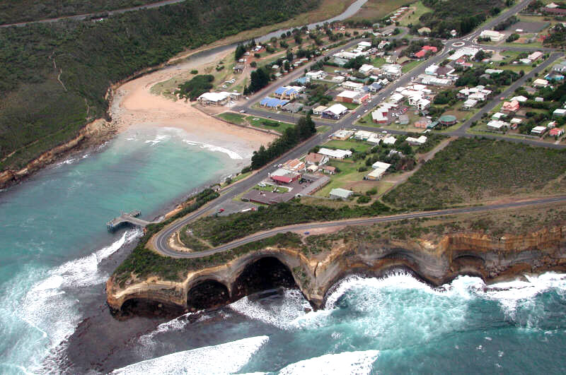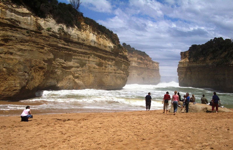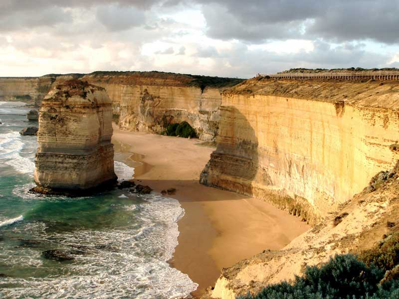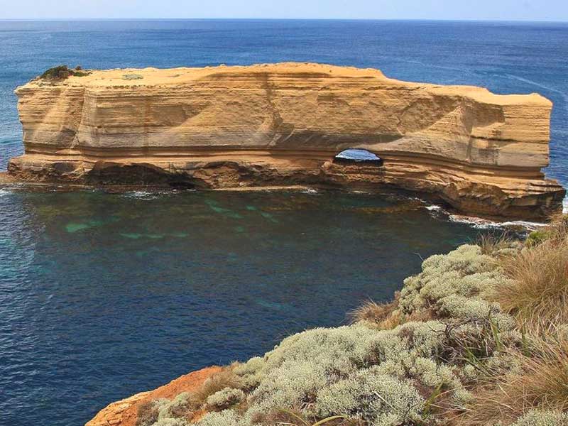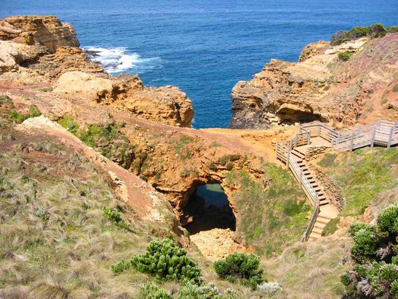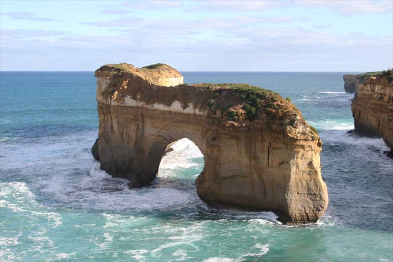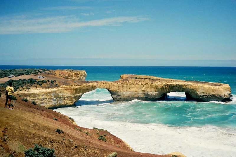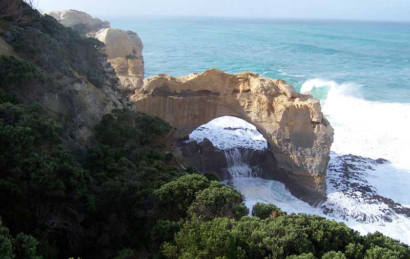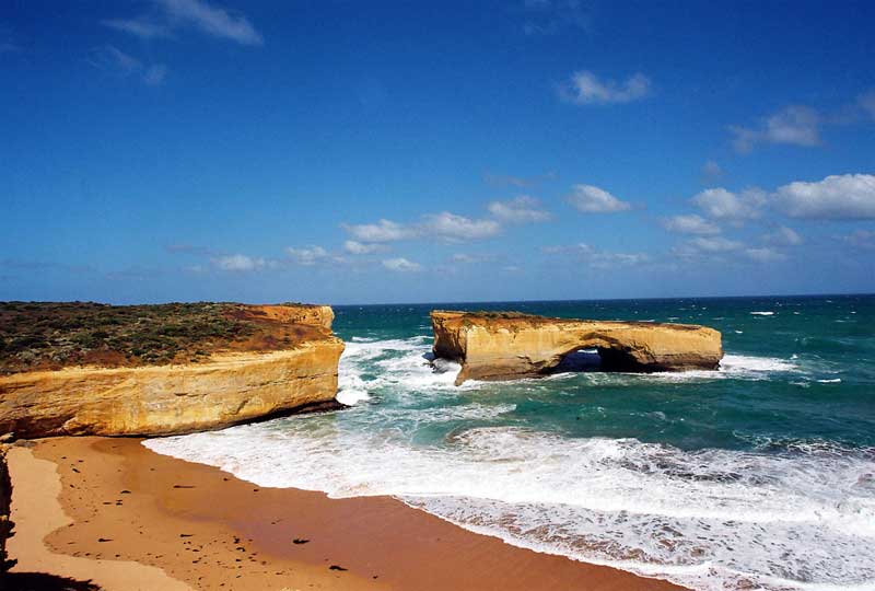 This dramatic natural bridge was once part of a string of arches named London Bridge. In the late 1980s the Australian Conservation Society commissioned a group of engineers to study the stability of the bridge. After intensive research, the engineers declared that the bridge would remain intact for several decades to come. Approximately sixteen weeks later, on 10th January 1990, the main arch of the bridge collapsed. At the time, a man and woman were on the far end and were thus trapped. The couple had been out in the elements for several hours before a helicopter finally rescued them. When the couple was brought to shore they absolutely refused to be interviewed or have their pictures taken. One reporter was very persistent and would not leave the two people alone. He asked them if they were married and the man answered, "Yes, but not to each other." The reporter finally understood why they would not give an interview. The arch has two viewing platforms to take in the sweeping vistas.