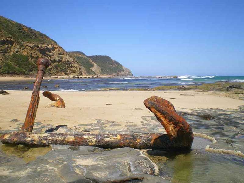 Wreck Beach is accessed from the lookout via a path and nearly 400 steps down the cliff face to the Southern Ocean at Moonlight Head via Yuulong. Those who make it are rewarded with spectacular views and the sound of the ocean crashing on the rocks. There are two easily accessed ship wrecks on wreck beach - the Marie Gabrielle and the Fiji. An iron anchor and part of the capstan from the French barque Marie Gabrielle anchors, wrecked in 1869, are located near Moonlight Head. Location: 20.5km east of Princetown. Turn off the Great Ocean Road 16km east of Princetown (signed Moonlight head).