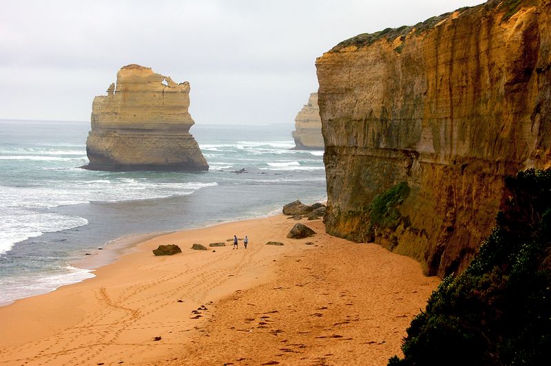 This stairway's 86 steps provide one of the few access points to a beach along this cliff-dominated section of coast. The beach is backed by a 20 to 30 m high, sheer limestone cliff. Next to the cliff-top car park, steps were cut by an early fisherman into the soft limestone to provide access to Gibson's Beach. The two limestone stacks towards the western end of the beach - Gog and Magog - are also visible from the southernmost 12 Apostles viewing platform. Tide and ocean condition permitting, walks are possible to the east and west of the steps.