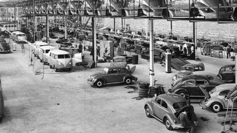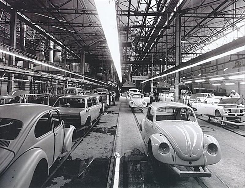 Volksagen Beetles being assembled alongside Datsun 1600s at Clayton, 1969