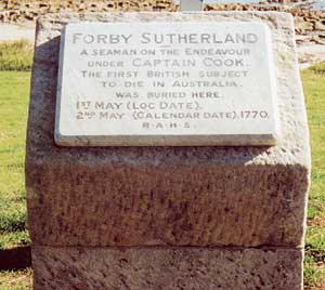 Botany Bay is the resting place the first two Europeans to have been buried in marked graves on Australian soil. Near Cook's Landing Place is the grave of Scottish Seaman Forbus (Forby) Sutherland, of James Cook's Endeavour who died of tuberculosis on 30th April, 1770, the day after the vessel was brought to anchor in Botany Bay. His body was brought ashore and buried the following day near a watering place used by Cook (the small creek still flows today) who named the nearby headland Point Sutherland in his memory. The location is marked by a cairn.