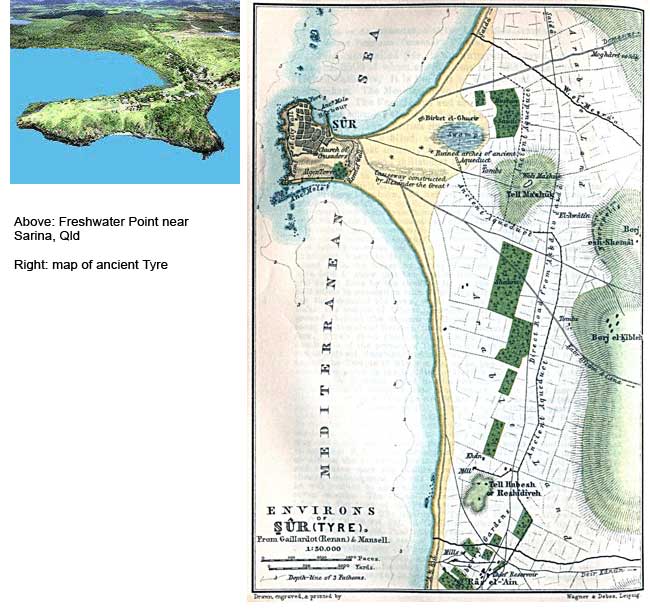 Numerous reports of artifacts, inscriptions and ruins of harbours and settlements from other localities around Australia have been privately documented and reported but the official stance has always been to reject the claims outright until more tangible evidence is forthcoming. Osborn first began examining the site at Sarina in 1990. After much research, he has concluded it may well be a typical Phoenician colonial settlement dating from around 1000BC. Similar sites to what Osborn believes he has found exist around the North African Coasts with Carthage, an old capital, and Tyre (right) and Sidon, as Mediterranean capitals of the era I500BC.