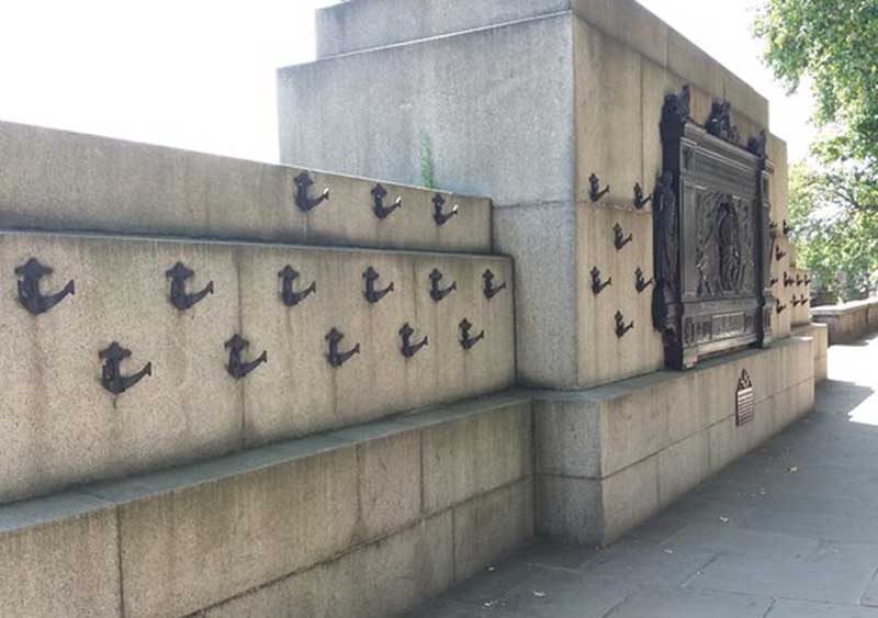 It is sited at Whitehall Steps, near Cleopatra's Needle, between the north-bank ends of Charing Cross Bridge and Westminster Bridge, and directly to the east of the main Ministry of Defence building on Whitehall. The Fleet Air Arm Memorial and the Battle of Britain Monument are nearby.