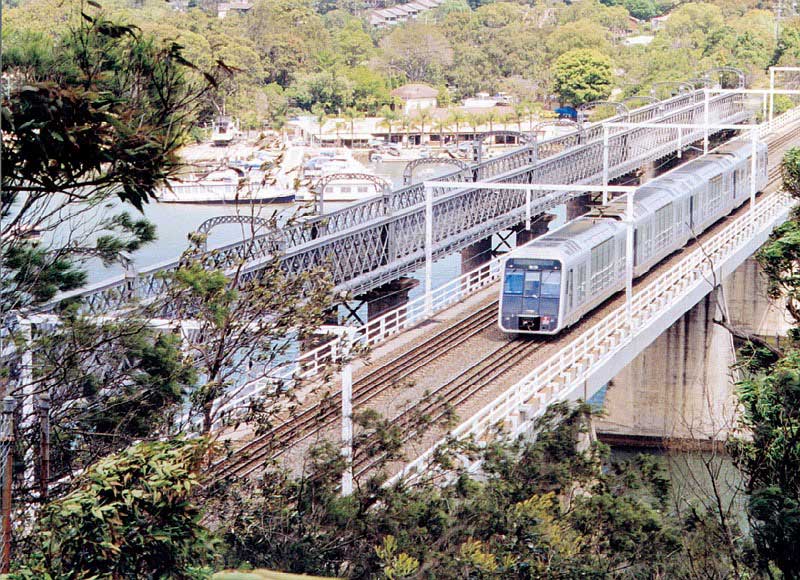 Como bridge takes the Illawarra railway line across the Georges River between the Sydney suburbs of Oatley and Como. The original bridge, opened on Christmas Day 1885, remained in use until 1972 when a new double line, pre-stressed concrete structure alongside it was completed and began taking rail traffic. The old bridge was saved from demolition as it carries the pipeline from Woronora Dam to the reservoirs at Penshurst, a function that commenced in 1945 and continues today. The bridge is today used as a footbridge and cycleway.