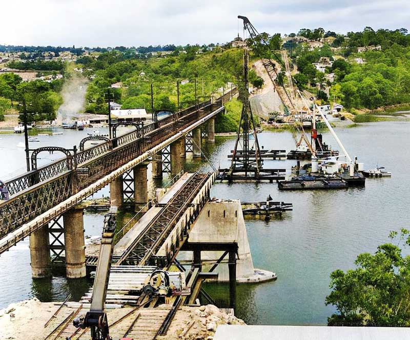 When the bridge components were landed at Botany, they were assembled on platforms mounted on barges. The platforms were built to a height where at high tide they would be marginally higher than the piers on which the spans would eventually rest. As each span was completed, the barge on which it had been constructed was towed to Como and positioned at high tide between the piers upon which the span would eventually rest. As the tide fell, the span lowered itself onto the piers at which time a team of men manoeuvred the span into place by hauling ropes attached to each end of the span. Once in its correct position, the span was bolted securely to the piers and the following day the next span was brought upstream and the process repeated.