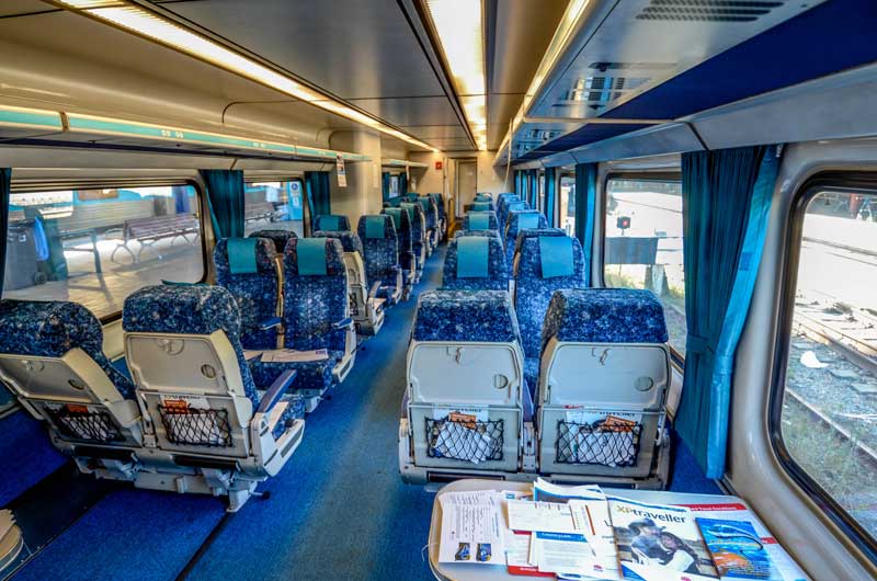 The XPT has recently undergone refurbishment with new seat covers, carpets, curtains and toilets. In addition, a striking new blue livery has been applied. XPT's and Xplorers are serviced and washed at a special centre in Sydenham where necessary maintenance is carried out. Even the windows are blow-dried on the way through. The service centre recycles rinse water as wash water which is then discharged with other run off through a treatment plant before being used again.