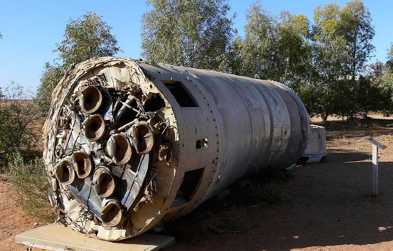 Remains of the first stage of a Black Arrow three stage rocket, showing the eight nozzles of its Gamma engine. Launch R3 was successfully launched from Woomera rocket range in October 1971. This portion of the rocket is now in the Memorial Park at William Creek, South Australia, having been recovered from the surrounding Anna Creek Station. Photo: John Hayman, 2007.