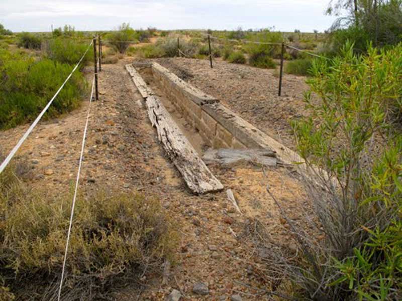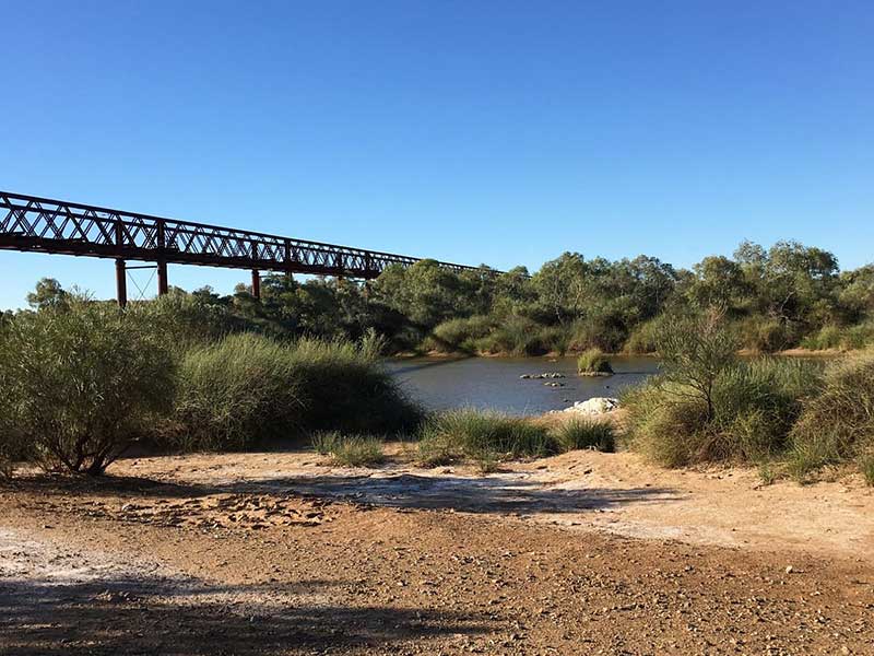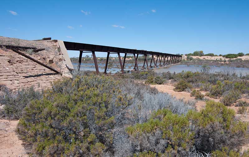 The Algebuckina siding ruins are near the Neales River where there is a permanent waterhole. The bridge over the Neales River is one of the most impressive bridges on the old line. It was opened to traffic in 1892. It consists of 19 spans, At 12 metres above the river and 578 metres in length, it is the longest bridge ever built in South Australia.