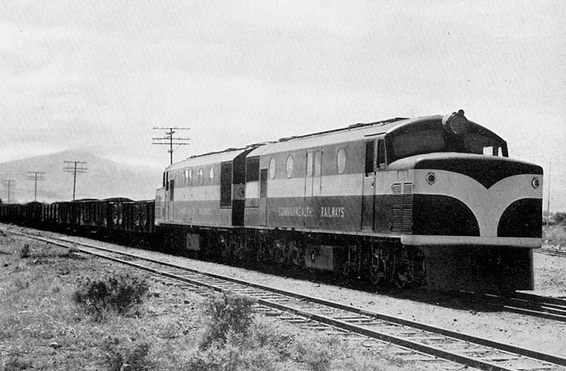 Commonwealth Railways Clyde-built single-cab NJ class loco hauling a goods train through Edwards Creek Siding, 1971