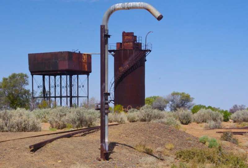 The old Beresford railway siding was one of the sites along the line which had giant water softeners to prepare water for the steam locomotives. During World War II the rail line was pressed to its limits and freshwater was limited. The de-mineralisation towers were built to remove salt from bore water so that it could be used by the trains. In addition to the water softeners there are some fettlers cottages adjacent to the Oodnadatta Track, but little else. The square tank contained the water for the steam engines.