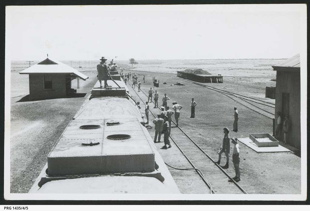 Service personnel at Edward Creek railway siding, during transfer to Darwin - with the photograph taken from the top of one of the carriages looking along the length of the train. The photographs numbered 3-11 are collectively labelled by the photographer as 'cattle - 1st class to Darwin'. A researcher has commented : The photograph was taken at Edward Creek railway siding on the Central Australia Railway [between Marree and Oodnadatta]. Edward Creek was an important stopping point for locomotives and passenger carriages to take on water until the last 'Ghan train' ran in 1980. Photo: State Library South Australia>