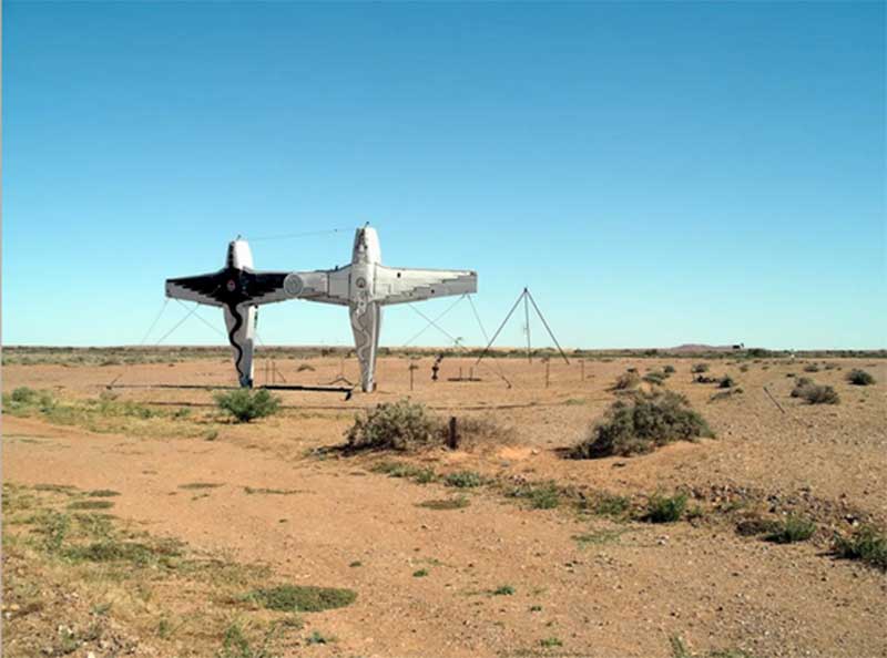 16km beyond Wangianna at Alberrie Creek Siding is one of its the most unusual – and most recent – landmarks along the track - Mutonia Sculpture Park The workmanship of a former mechanic, Robin Cooke, its artworks were apparently inspired by “mad Max”. Here, all sorts of weird and wonderful installations have been created out of waste or unwanted materials. “Plane Henge”, two Cessnas standing Christ-like on their tails touching wingtip to wingtip, is the most well known works of art in this unique park.