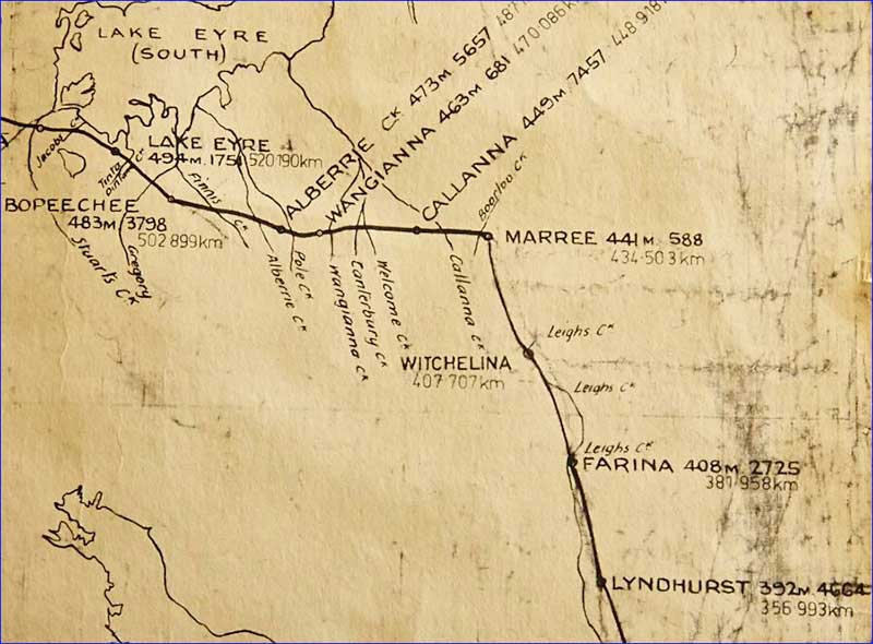 The new railway commenced at Port Augusta by the South Australian Government and headed north-east via the Pichi Richi Pass via Quorn, Hawker and Parachilna. By 1881 it had reached Beltana. Within two years it passed through Copley and reached Farina. As the line to Farina was completed, work was beginning on a southern line from Palmerston (Darwin) that was intended to join up with the southern line when they both reached Alice Springs. By 1888, Pine Creek was reached, but no further work was carried out on the extension of this line until 1926. By 1884 Hergott Springs (Marree) had become the railhead of the southern line. After some years the line was pushed further north past Callanna, Alberrie Creek, Curdimurka, Coward Springs, Strangways Springs, William Creek, Anna Creek, Box Creek, Edwards Creek, Warrina, Algebuckina and Mount Dutton until it finally reached Oodnadatta in 1891. Oodnadatta remained the railhead for the next forty years.