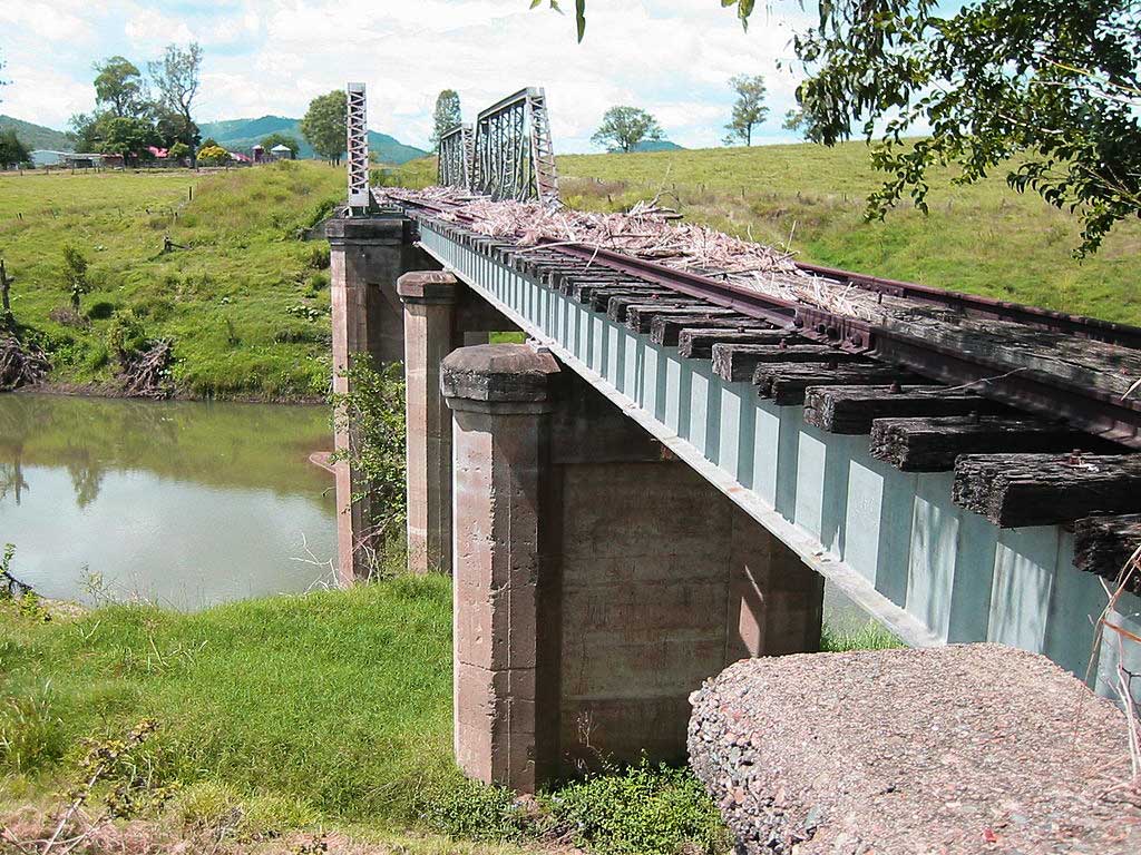 There are now only three large engineering structures left on the Brisbane Valley rail line. These are the steel and timber Lockyer Creek railway bridge over Lockyer Creek at Clarendon designed by Chief Engineer HC Stanley; the steel and concrete Harlin Rail Bridge over Maronghi Creek at Harlin; and the Yimbun Railway Tunnel. Approximately two dozen timber rail bridges are still intact, although their condition varies greatly.