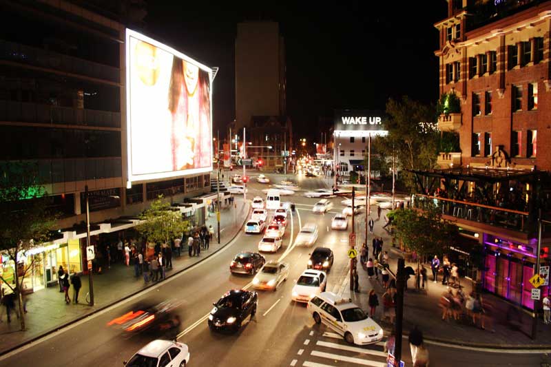 Kings Cross railway station is an underground station in the inner-city locality of Kings Cross, approximately 2 kilometres east of the Sydney central business district. For many years it was Sydney's red-light district, ith its its bars, restaurants and nightlife. Kings Cross was once known for its music halls and grand theatres, but it was rapidly transformed after World War II by the influx of troops returning and visiting from the nearby Garden Island naval base.