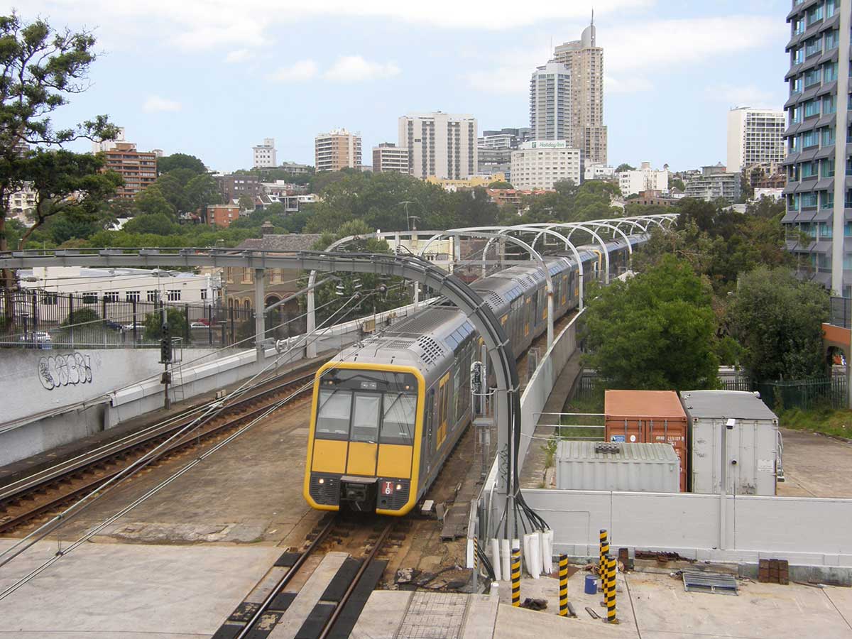 Mounted on concrete pylons above ground level, the dual line Eastern Suburbs Railway line cuts a swaithe through the suburb of Woolloomooloo after leaving Martin Place station. It exits the city via a tunnel under The Domain where it emerges above Sir John Young Crescent. It then passes overhead through Woolloomooloo, before returning underground at McElhone Street prior to entering Kings Cross Station.
