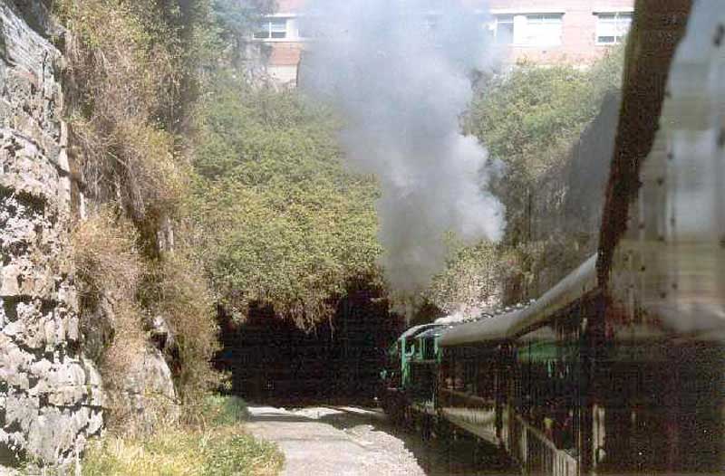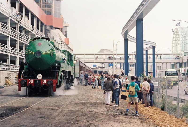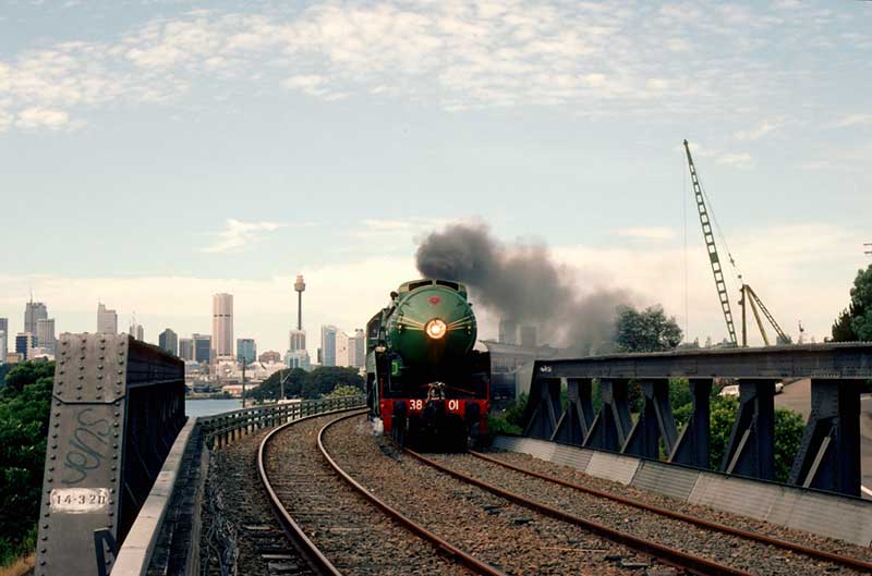 Steam locomotive 3801 on what was the last remaining line of track at Darling Harbour during the 1988 Bicentennial celebrations