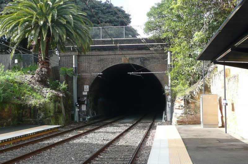 Pyrmont's John Street Tunnel was built, opened and closed for traffic simulatanous to the Glebe Road tunnel. A curved, brick-lined 123.8 metre long tunnel, its takes the line under the sandstone heart of the Pyrmont peninsula. This tunnel is bored through the escarpment and is brick-lined. It exits near Jones Street at Saunders Lane and the line continues in a cutting.