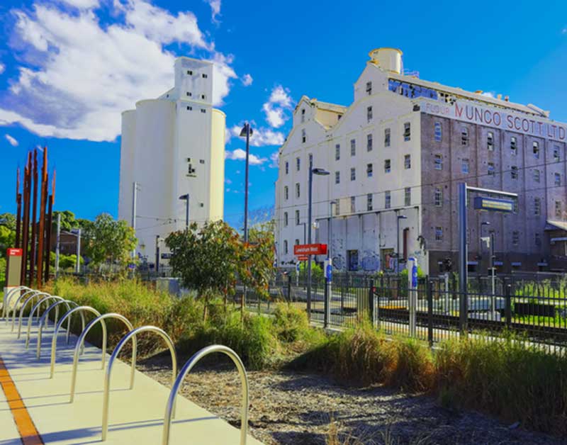 The whipple truss bridge over Long Cove Creek was constructed 1885-1886 featuring North American technology developed by Squire Whipple. It is probably the most significant railway bridge site in Australia, certainly in NSW. It has the unique distinction of four different types of bridges from different eras. Engineers Australia designated the Viaduct in 1994 as an historic engineering marker. There are two stations serving Lewisham on the Inner West Light Rail. These are Lewisham West, adjacent to the former flour mill on the border with Summer Hill, and Taverners Hill, near Parramatta Road.