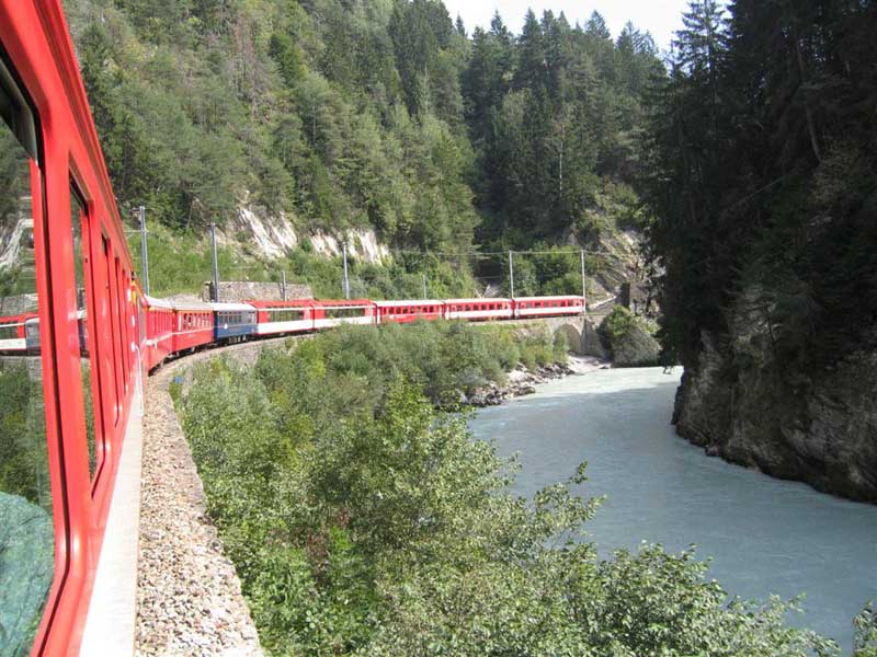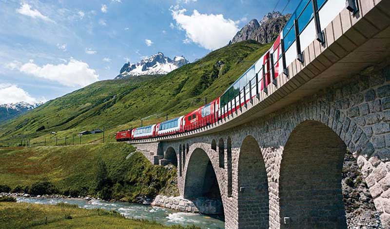 The Glacier Express is an express train connecting railway stations of the two major mountain resorts of St. Moritz and Zermatt in the Swiss Alps. The train is operated jointly by the Matterhorn Gotthard Bahn (MGB) and Rhaetian Railway (RhB). For much of its journey, it also passes along and through the World Heritage Site known as the Rhaetian Railway in the Albula / Bernina Landscapes.