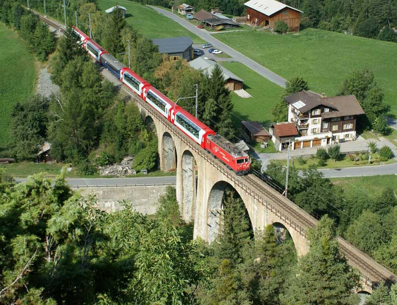 The trip on the Glacier Express is a 7 hour 30 minute railway journey across 291 bridges, through 91 tunnels and across the Oberalp Pass on the highest point at 2,033 m (6,670 ft) in altitude. The entire line is metre gauge (narrow gauge railway), and large portions of it use a rack-and-pinion system both for ascending steep grades and to control the descent of the train on the back side of those grades.