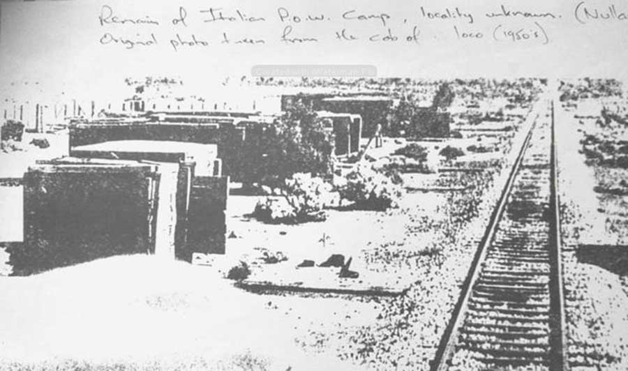 Located 490 km east of Kalgoorlie on the WA side of the border, Nurina was the site of a World war II Prisoner of War camp. It was officially known as the Cook POW Labour Camp No. 3 POW Labour Detachment. In April 1942, approximately 300 Italian prisoners of war were put to work on the Trans Australian Railway to expedite sleeper renewals. These men were placed at six locations where camps had been prepared for them. A Military camp was established at Cook for the headquarters staff. During the twenty months the prisoners of war were engaged on this line, the highest effective strength was 240. Most of the POWs were repatriated to their homelands by the middle of 1947 although some were given permission to remain in Australia. Very little remains today of the camp.
