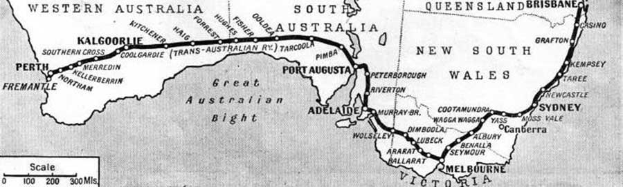 A Federal Act passed in 1907 provided for the expenditure of a sum of £20,000 for a preliminary survey of a railway line connecting Western Australia with the eastern States. This survey was commenced in 1908, and was completed in March, 1909. The route via Tarcoola was, for several reasons, chosen in preference to that via Gawler Range and Fowler's Bay. The estimated cost of construction and equipment of the line on the basis of a 4-ft. 8 1/2-in. (1,435 mm) standard gauge, from Port Augusta in South Australia to Kalgoorlie in the Western Australian goldfields, a distance of 1,710 km, was £4,045,000. In September, 1911, a Bill was introduced into the Commonwealth Parliament to authorise the construction of the line, and it became law in December following.
