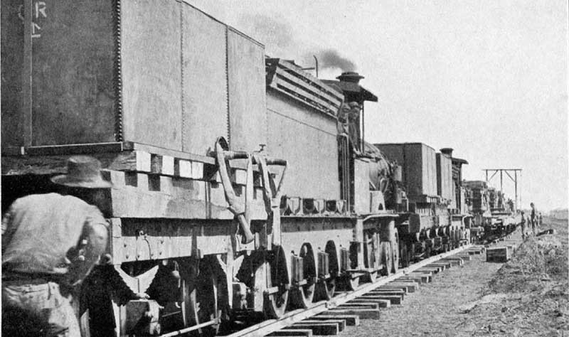 At first preparatory work at each end of the line had to be done, and it was not until March 1913, that any platelaying had been carried out. By 30th June, 1913, 5.6 km of line on the 3-ft. 6-in (1067 mm) narrow gauge, and 1.6 km on the standard gauge, had been laid in the depot at Kalgoorlie, the corresponding lengths at Port Augusta being 7.3 km and. 4 km respectively. Platelaying on the main line was commenced on the eastern division on April, 1913, and on the western division in May, 1913.