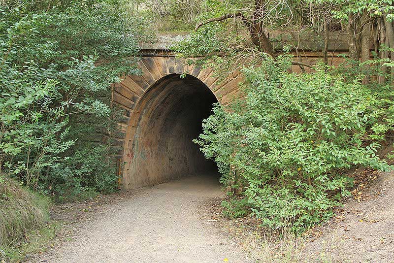Not far away from the viaduct the disused 180 m long Old Main Railway Tunnel (Redbank Range Tunnel) between Picton Junction and Thirlmere was opened in February 1867 and was the first railway tunnel to be used by the NSW Railways. It was closed to rail traffic in 1919 when the new deviation line opened. During World War II it was one of a number of disused railway tunnels in the Sydney area in which ammunition, mustard gas spray tanks and other military supplies were stored. After the RAAF moved out in 1950, it was used for commercial mushroom growing.