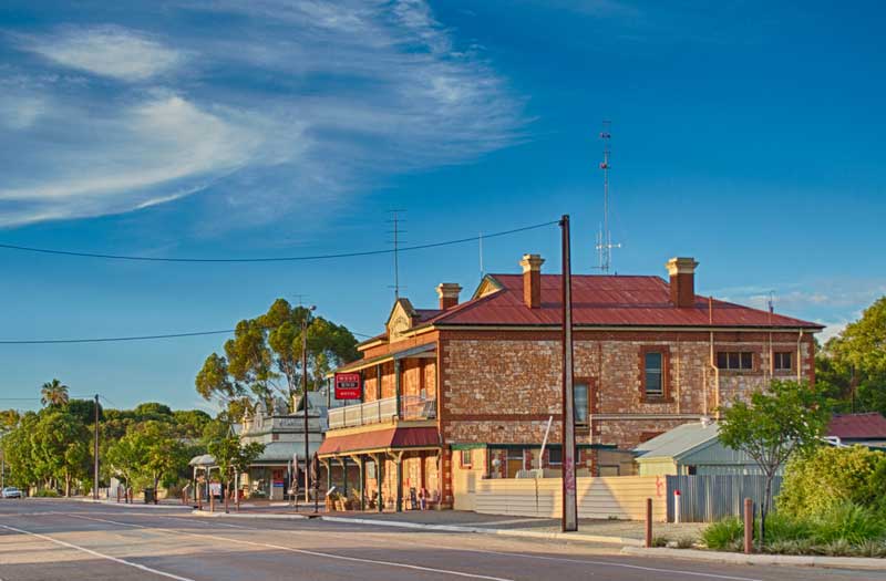 Geoergetown, a few km to the south, is quite close to Gladstone, but stayed small while Gladstone grew as it was on the railway. The largest township surveyed in the Mid North (in 1869), Geoergetown sits on land once held by Bundeleer station. It has some notable regional SA architecture and a fine wall mural depicting a record day's reaping of a wheat crop. Geoergetown was at the heart of the development of grain crop expansion of the region.