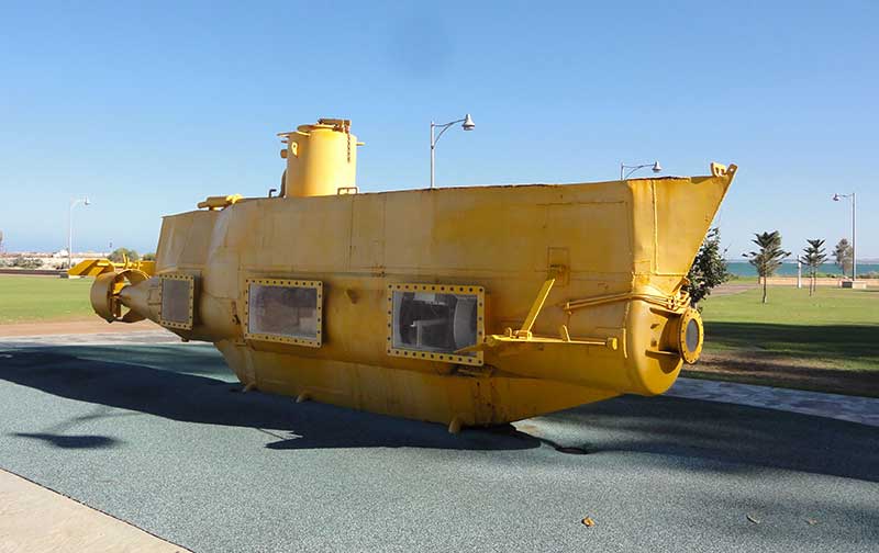 The Beatles sang about a Yellow Submarine, but the crayfishen of Geraldton actually built one. One of the many icons of Geraldton, the Yellow Submarine was designed and built in Dongara in the early 1970s to look for where on the seabed the crayfish were. It has a small cabin and room for two operators. It is amazing just how small the cabin area is for the two people it takes to operate the submarine.