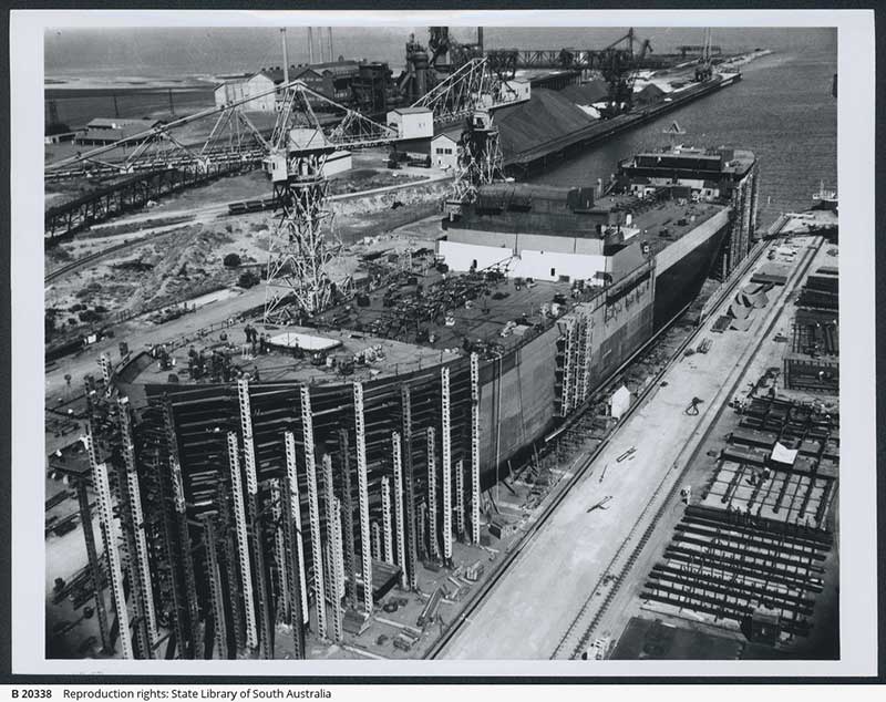 With its five slipways enabling the simultaneous construction of five ships, Whyalla became the largest merchant shipbuilding centre in Australia. The new shipyard incorporated many of the best features of modern British and American shipbuilding practice. All these facilities were built up in a town remote from other industrial centres, where housing for the large influx of workers for this and many other projects had to be provided.