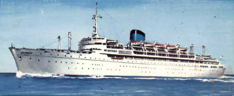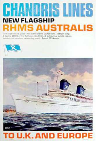 Built in 1940 as the SS America for the United States Line, she was commandeered by the US Navy before completion and was used as a troop carrier. Returned to United States Line in 1946, she operated successfully for sixteen years on the London to New york North Atlantic run. America was purchased and renamed Australis by the Chandris line in November 1964 as one of two replacements for the Brittany (the other was Britanis) and underwent a major refit in Greece, which doubled her passenger capacity and increase her displacement. She became a regular on the Southampton-Piraeus-Australia run until her withdrawal at the end of 1977, making her maiden voyage from Piraeus to Australia in August 1965.