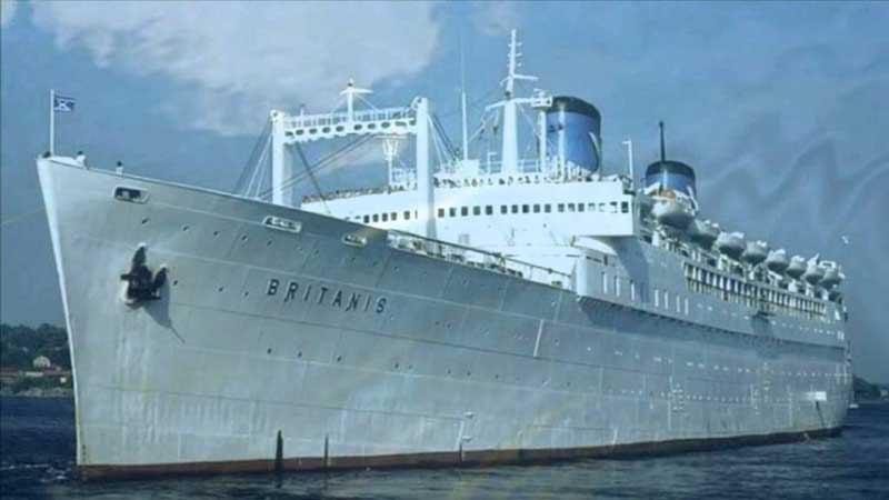 During the ensuing refit at Piraeus, her capacity was increased to 1,655 by converting her cargo holds to cabins, dividing many of her larger cabins into smaller units, and expanding her superstructure slightly forward on Upper Deck level. Her funnels were given streamlined casings, her mainmast was removed and she was renamed Britanis. Her first voyage in round-the-world service left Southampton on 21st February 1971 with a mix of migrants and world travellers. She remained on the Southampton-Sydney-Southampton service until 1974, when she began winter cruising in the Caribbean and summer cruising in Europe. In May 1982 she was transferred to a Chandris subsidiary, Fantasy Cruises, for cruising between New York and Bermuda A major refit in 1986 extended her life, as did the availability of parts from her sister Ellinis and the Homeric when that ship was scrapped in 1974.