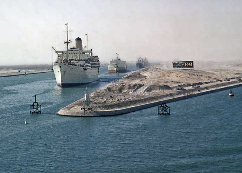 SS Arcadia leads a southbound convoy through the Suez Canal, August 1961