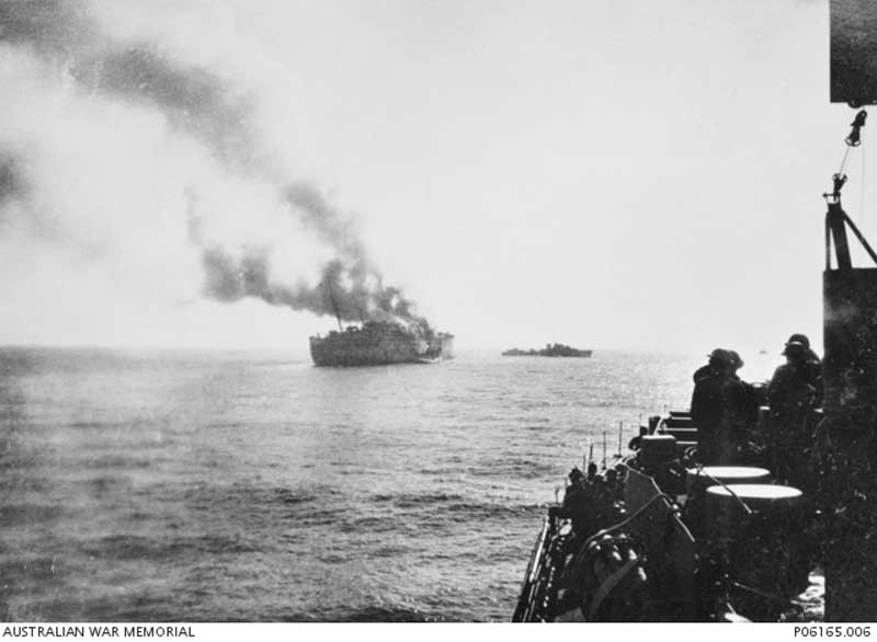 View from HMAS Quiberon towards the heavily damaged SS Strathallan before she sank. Photo: Australian war Memorial