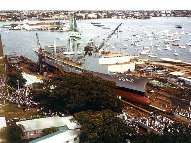 Launch of HMAS Success, Cockatoo Island Shipyard, 1984