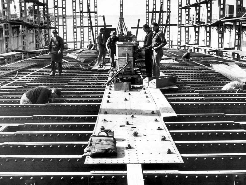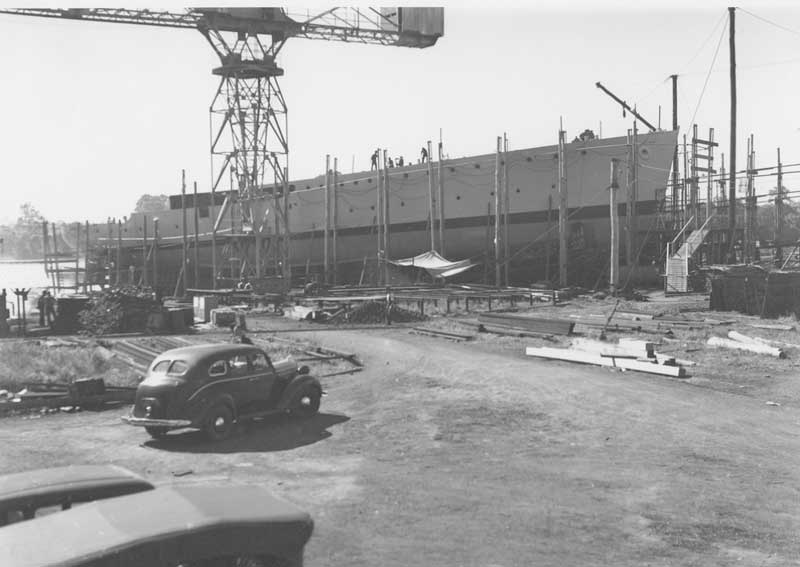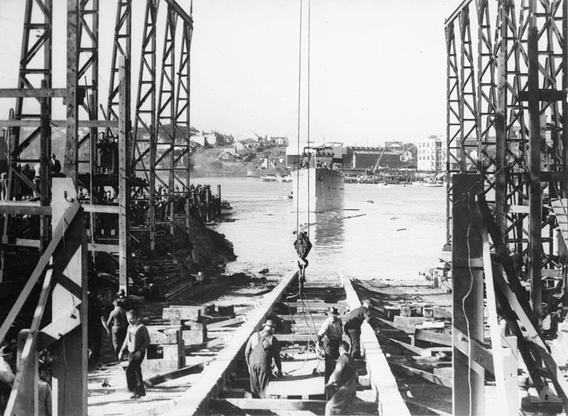 The dockyard launched its first vessel in July 1943. By the end of World War II, it had launched two ships for the Royal Australian Navy and 22 vessels for the United States and had repaired six hundred ships. A 15,000 ton floating dock was located at Dyke Point in 1943 to repair damaged ships during World War II. The floating dock was scrapped in 1977.