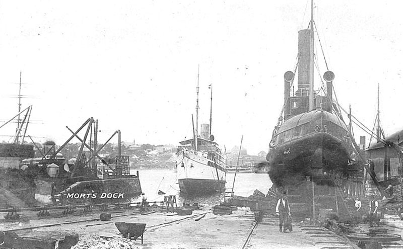 Mort Bay, once the hub of Sydneys shipbuilding industry, is located immediately south west of Goat Island where the Parramatta River enters Sydney Harbour. It is named after Thomas Sutcliffe Mort, the merchant and businessman who established the first dry dock in Sydney there in 1854. This was created by the excavation of sandstone near the head of Mort Bay. Morts Dry Dock was the first dry dock in Australia, opening for business in 1855 and closing more than a century later in 1959.
