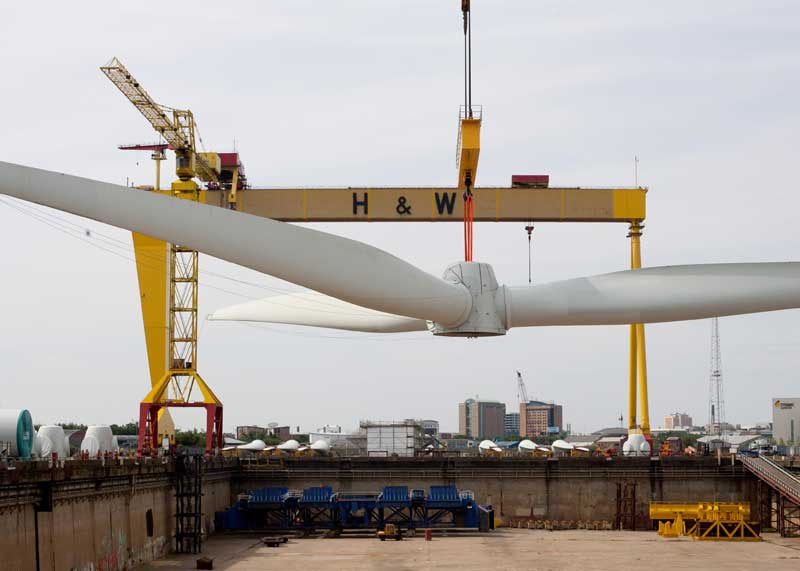 Turbines for the Ormonde Offshore Windfarm being assembled at Harland & Wolff, Belfast.