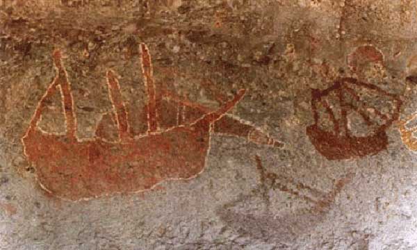 Ancient relics are further proof of Chinese visits to our shores. In 1948 fragments of Ming period {14th Century} blue and white porcelin were dug up on Winchelsea Island, north west of Groote Eylandt; and a large copper urn of this age was unearthed in Arnhem Land some years ago. Aboriginal cave paintings of the Arnhem Land and the Kimberleys region include depictions of Chinese junks dating back hundreds of years.
